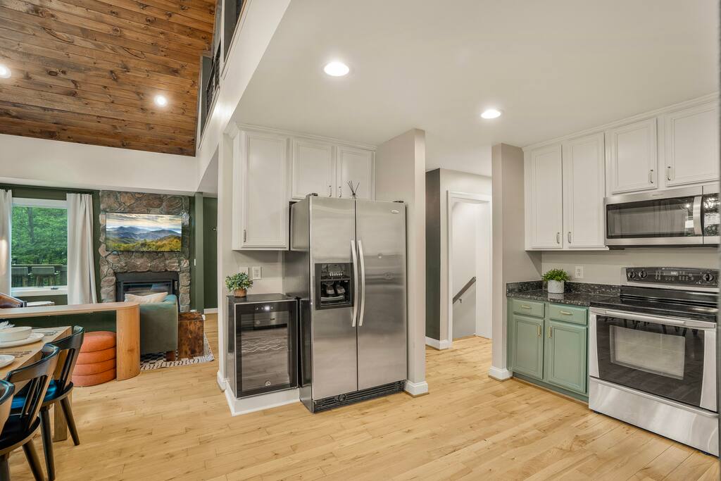 - Large kitchen equipped with an electric range, full-sized refrigerator, and a brand-new dishwasher. Fully stocked with stainless steel pots and a beautiful stoneware dinner set - everything you need to create delicious meals for your whole crew.