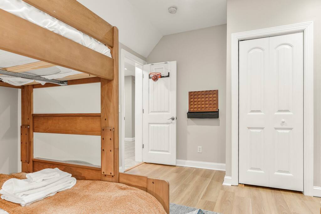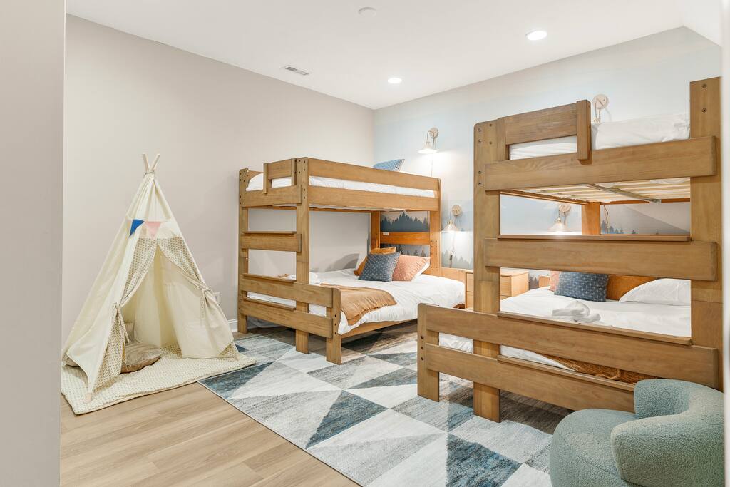 - Bedroom 5: Two twin-over-full bunk beds that sleep 6 kids comfortably, complete with mini basketball hoop, Connect 4, and a play tent to keep the little ones happily entertained.
